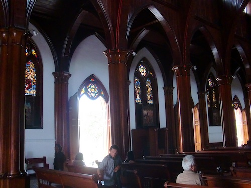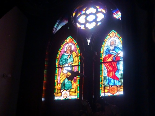 ↑木を使ったシックな造りでステンドグラスもふんだんにつけられている