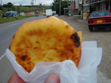 3度目のコーヒーブレイクのあとすぐ、脇を通る車から手が出てきてアレパを差し出してくれた。