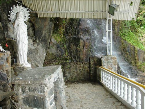 途中のくだり道の途中、勢いのある小さな滝とキリスト教に関係する建物があった。