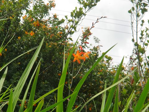 ↑☆の形をしたオレンジ色の花が道を彩る
