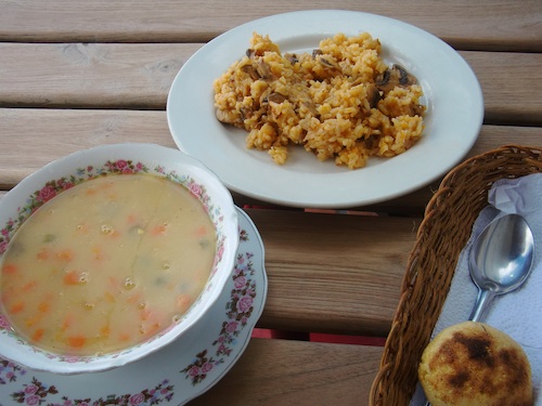 出してくれたのは、人参とコーンのスープとマッシュルームのチーズリゾット。