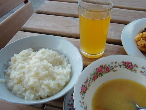 おいしく食べていると、ジュースにおかゆと次々に皿が出てくる。