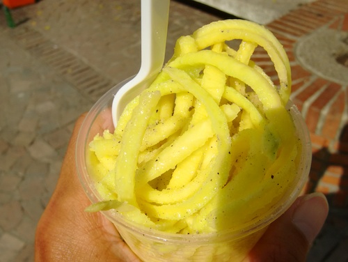 ↑広場で売っていたマンゴーの細切り。