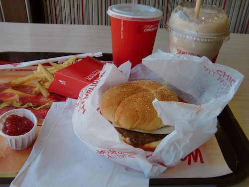 近くの食堂で食事をし、隣の店で飲み物を買って飲み干す。