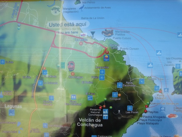 サンサルバドル側からずっと道路を道沿いに走っていると左手側にhotelなんとかという青い看板が見えるので、そこを看板にしたがって左、