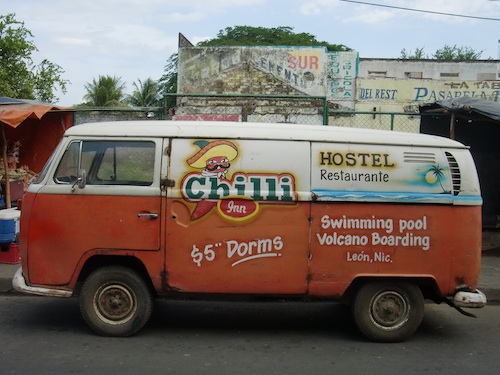↑ワーゲンバスに書かれていたホステル。5$らしいがどこにあるかわからないし、これでも最初の宿のほうが安い。