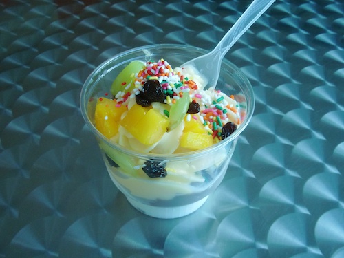 ↑ヨーグルトとチョコとマンゴーのソフトにフルーツなどをトッピング
